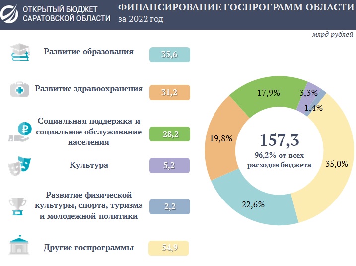 На финансирование 20 государственных программ Саратовской области направлено 157,3 млрд рублей, или 96,2% от совокупных расходов областного бюджета за 2022 год.