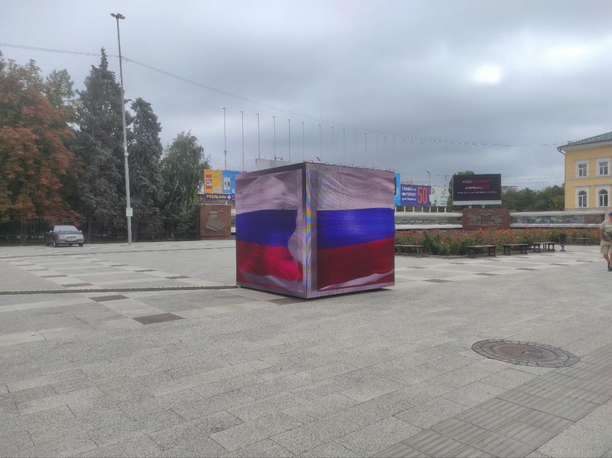 Около парка "Липки" в Саратове установили куб с экранами, на которых развевается флаг России.