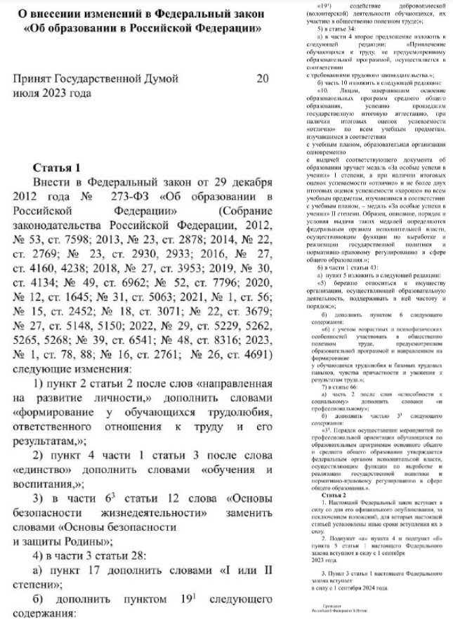 Президентом РФ был подписан законопроект № 365972-8 «О внесении изменений в Федеральный закон «Об образовании в Российской Федерации» , который регламентирует общественно полезную деятельность школьников.
