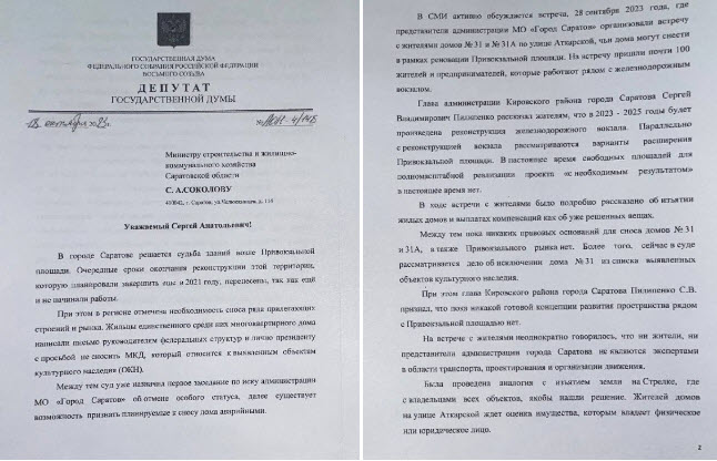 В связи с этим направила депутатские запросы министру строительства и жилищно-коммунального хозяйства Саратовской области С.А. Соколову , министру транспорта и дорожного хозяйства А.В. Петаеву , а также губернатору региона Р.В. Бусаргину с просьбой дать подробные пояснения по планируемой реконструкции ж/д вокзала, приложить к ним проектные решения, результаты исследований и иные документы, подтверждающие правильность и обоснованность реконструкции.