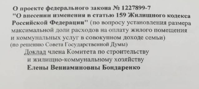 Коммунисты предложили установить, что федеральный стандарт максимально допустимой доли собственных расходов граждан на оплату жилого помещения и коммунальных услуг в совокупном доходе семьи должен составлять не более 15% , вместо нынешней нормы в 22% — фактически четверти доходов семьи.