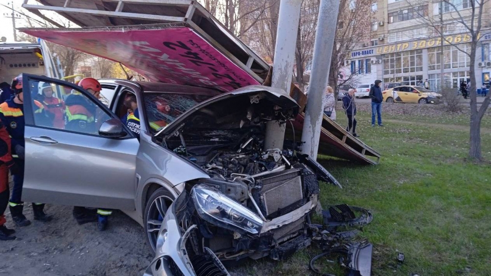 На Усть-Курдюмской BMW протаранил рекламный щит. Есть пострадавшие