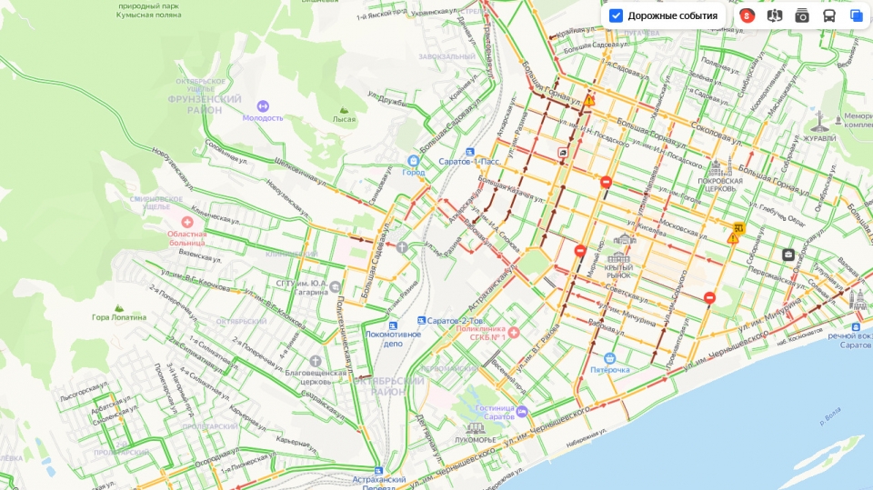 Сейчас стоит центр города, район СХИ, Танкистов, также все очень плохо на Большой Горной и Чернышевского по направлению к мосту "Саратов - Энгельс".