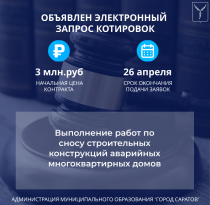 Объявлен электронный запрос котировок на выполнение работ по сносу аварийных многоквартирных домов. Место выполнения работ: г. Саратов, ул. Валовая д. 44 (Литер Б); ул. Валовая, д. 56 (Литер А); ул. им. Чернышевского Н.Г., д. 216 (Литер А); ул. Посадского, д. 146 (Литер В).