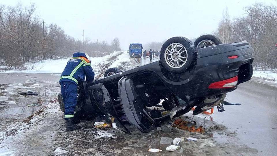В 10.59 на службу "112" поступила информация о том, что около села Бородаевка водитель "Рено" не справился с управлением на мокрой заснеженной трассе. В результате машину опрокинуло.