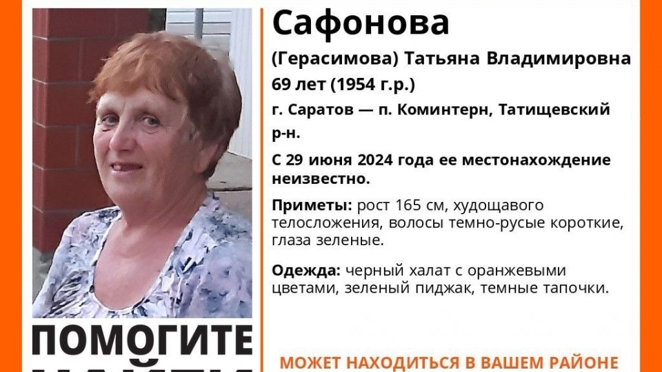 Пропавшая без вести в Саратовской области 69-летняя Татьяна Сафонова ( Герасимова ) найдена живой.