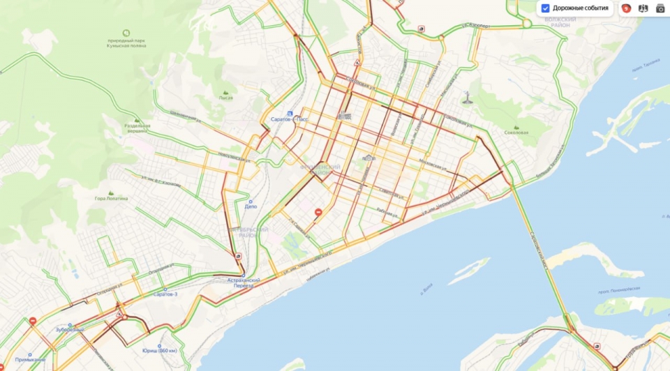 Сегодня к вечеру саратовцы перемещаются по городу через серьезные дорожные заторы.