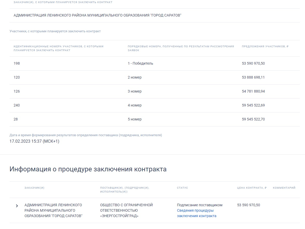 Изначально чиновники готовы были заплатить 59,54 миллиона рублей, но в ходе торгов было сэкономлено 6 млн рублей. Победитель снизил цену, за которую согласился выполнить работы, до 53,59 млн рублей. В итоге контакт собираются заключить с ООО «Энергостройград» (генеральный директор Роман Волков).