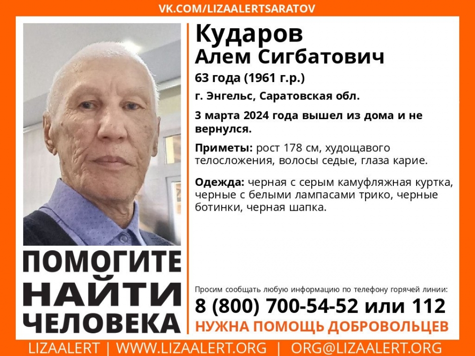 Сегодня в Энгельсе пропал 63-летний Алем Кударов . Об этом сообщает поисковый отряд "Лиза Алерт Саратов".
