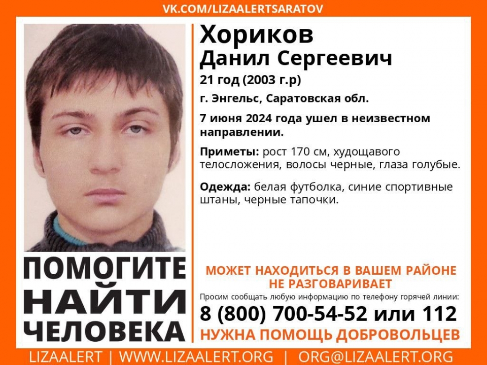 В Энгельсе не могут найти 21-летнего Данилу Хорикова , сообщает поисковый отряд "Лиза Алерт Саратов".