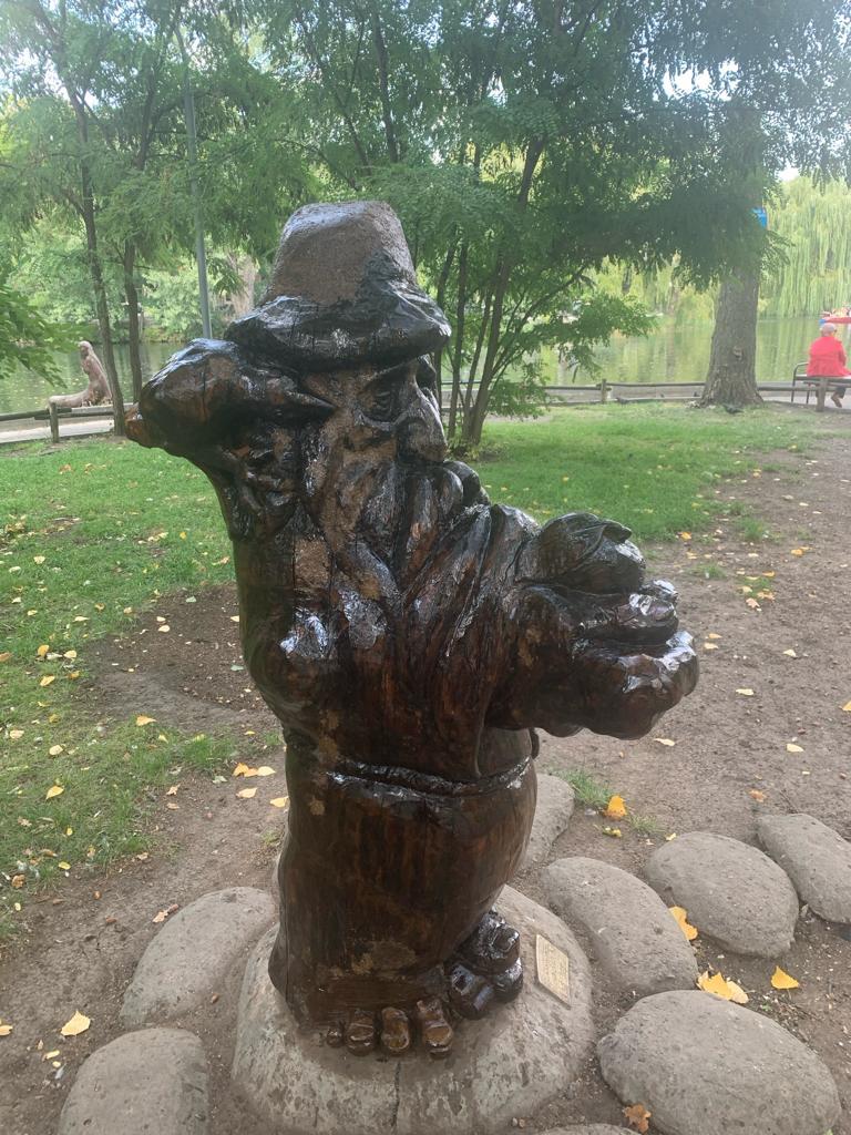 Около горбатого моста установили скульптуру гнома с яблоком. Отмечается, что реставрация оригинала оказалась невозможной, однако скульптор Виктор Колесников воссоздал практически идентичную копию персонажа из дуба черешчатого.