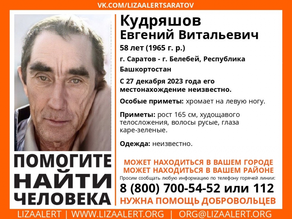В Саратове и Белебее ищут хромающего на левую ногу Евгения Кудряшова