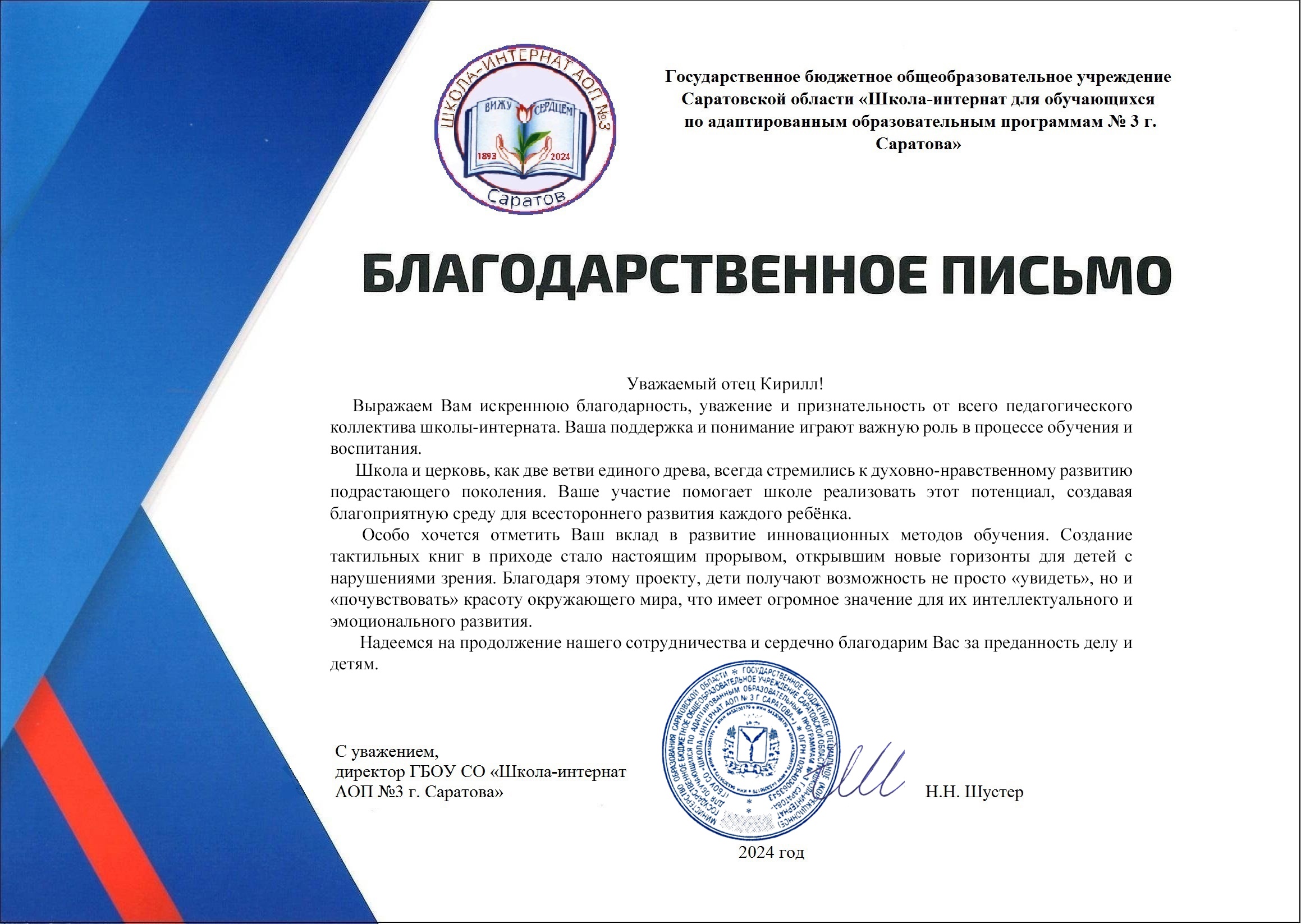Директор школы-интерната для слепых и слабовидящих детей №3 г. Саратова Николай Ноликович Шустер по окончании первого полугодия 2024-2025 учебного года вручил руководителю проекта по созданию рукодельных тактильных пособий для слепых и слабовидящих детей священнику Кириллу Петровичу благодарственное письмо, в котором выразил отцу Кириллу признательность за систематическую и плодотворную совместную работу.