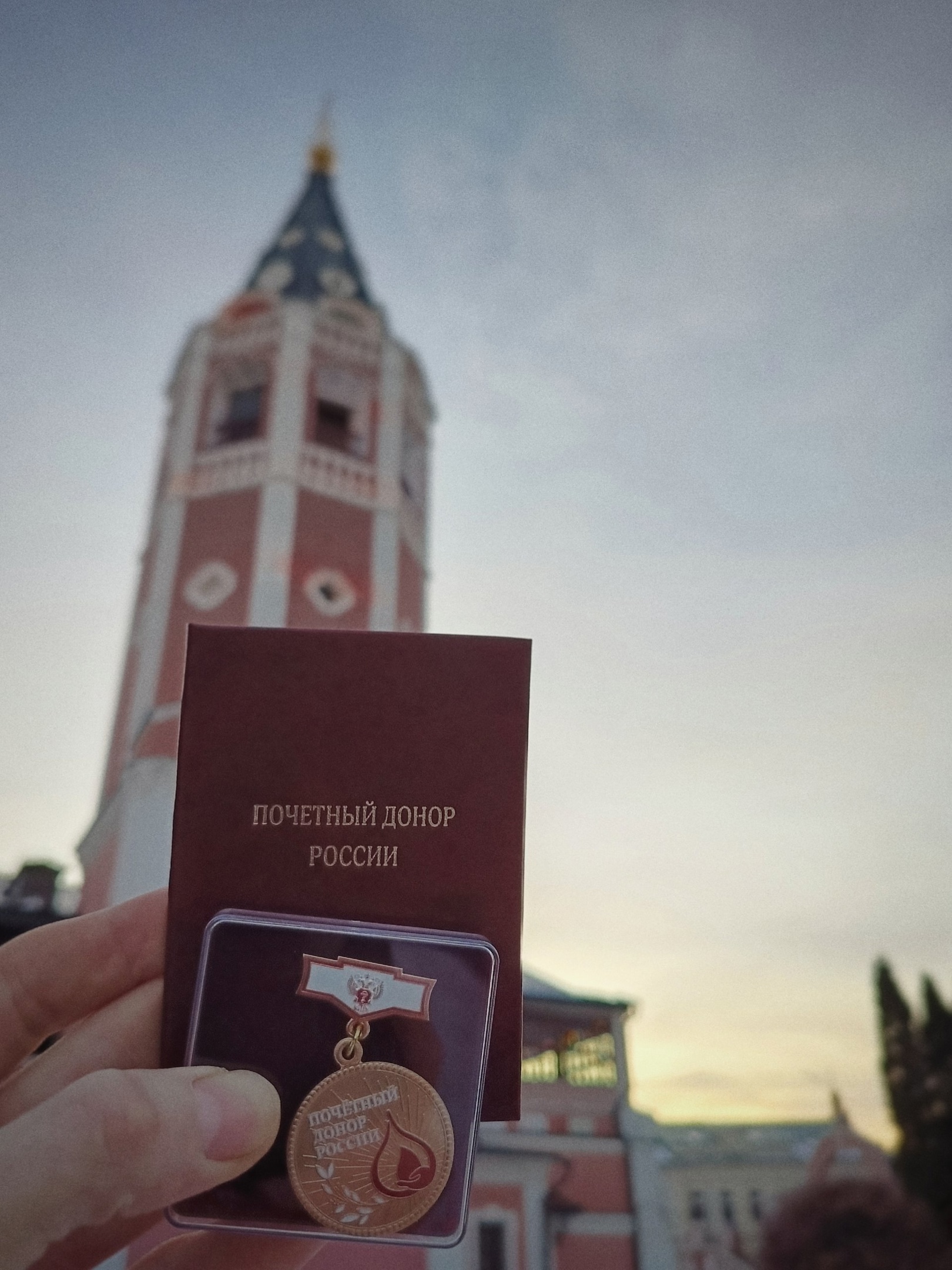 Потом было много других форм волонтёрства, сперва светского, затем под стягом православия, но неизменно удавалось, сдавая кровь самому, привлекать ребят к этому делу. Важным этапом в моём личном донорском марафоне были донорские акции на территории родного Свято-Троицкого собора. Не случайно награду я запечатлел на его фоне: почти половина кроводач были совершены на его территории.