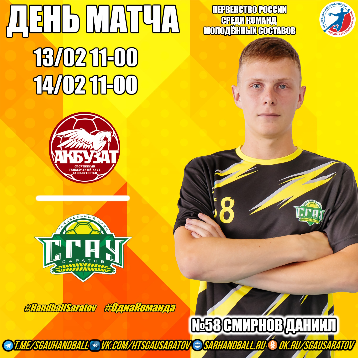 День матча! Акбузат-2 (Уфа) - СГАУ-Саратов-2 (Саратов) Первенство России среди команд молодёжных составов г. Уфа, УСЗ "Астра" 13 февраля, 11:00 (время саратовское) Трансляция: