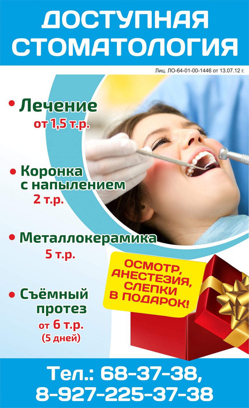 «Доступная стоматология» дарит в подарок пациенту осмотр, анестезию и слепки. В других клиниках за это нужно платить. Согласитесь, получить такой подарок – это выгодно.