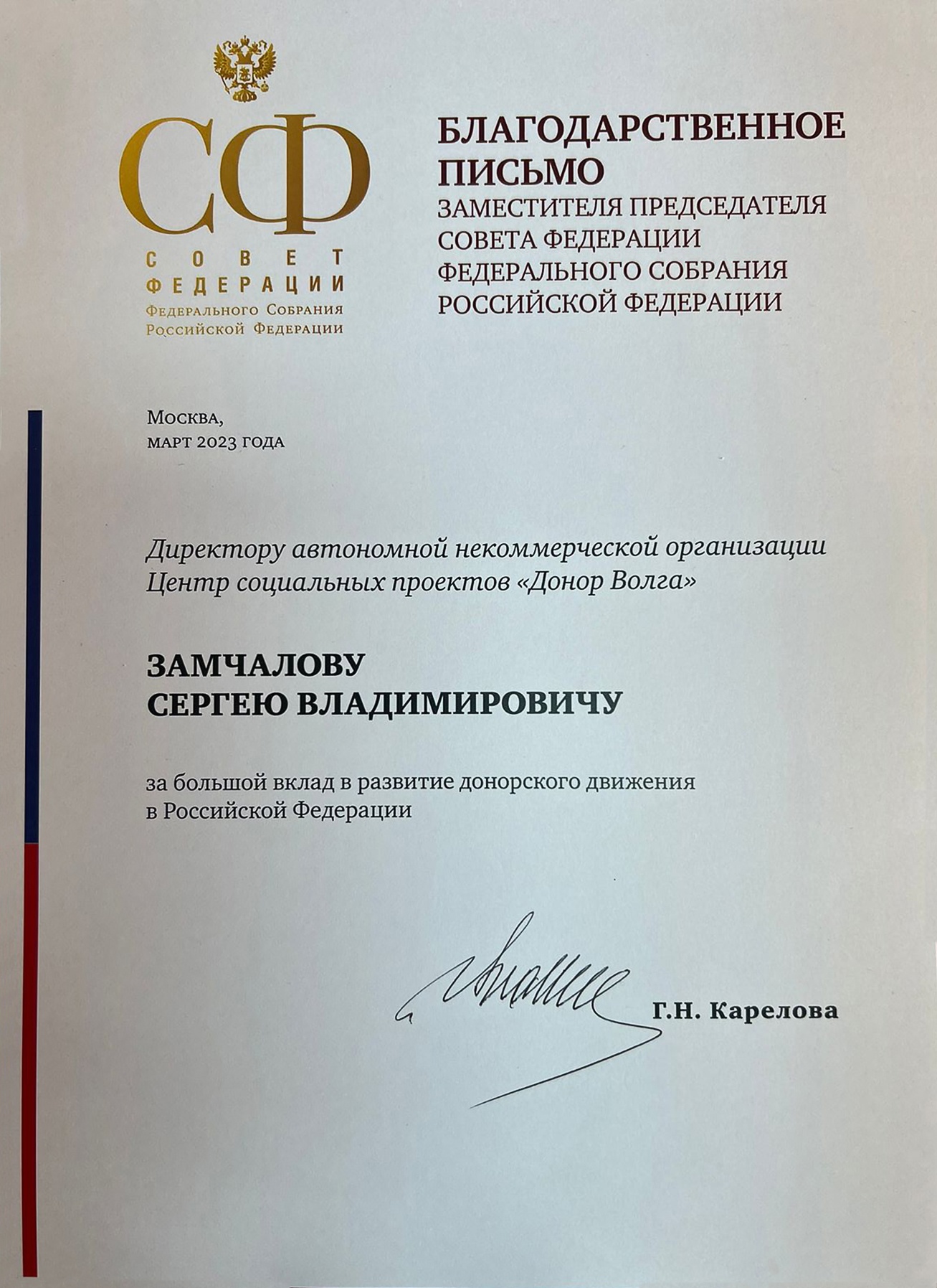 Сергей Замчалов получил Благодарственное письмо от Заместителя Председателя Совета Федерации Федерального Собрания Российской Федерации Галины Кареловой за большой вклад в развитие донорского движения в Российской Федерации.